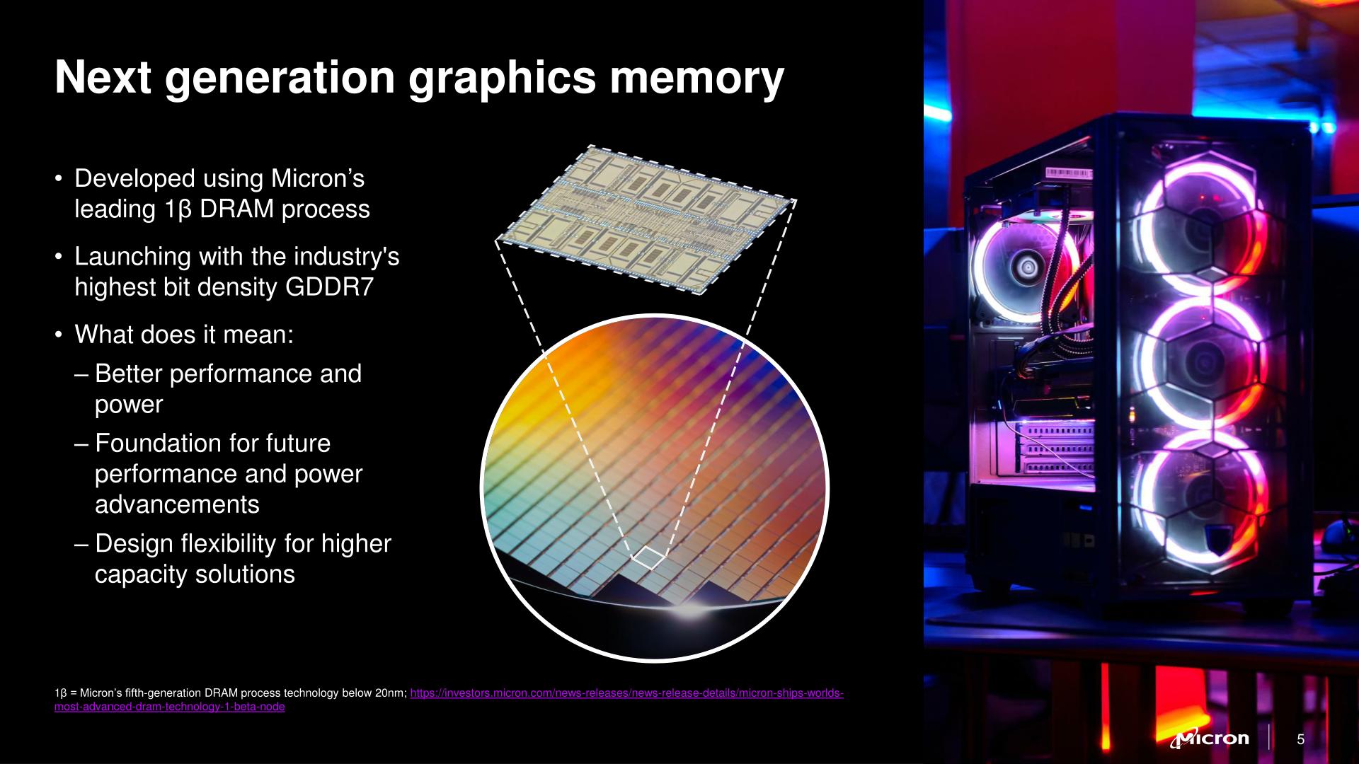 GDDR7 to Hit the Market Later This YearMicron's first GDDR7 chip is a 16 Gb memory device with a 32 GT/sec (32Gbps/pin) transfer rate, which is significantly faster than contemporary GDDR6/GDDR6X. As outlined with JEDEC's announcement of GDDR7 earlier this year, the latest iteration of the high-performance memory technology is slated to improve on both memory bandwidth and capacity, with bandwidths starting at 32 GT/sec and potentially climbing another 50% higher to 48 GT/sec by the time the technology reaches its apex. And while the first chips are starting off at the same 2GByte (16Gbit) capacity as today's GDDR6(X) chips, the standard itself defines capacities as high as 64Gbit.