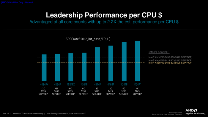 AMD’s new chips, in turn, are designed to compete against Intel’s entry-level Xeon-E family. Itself a redress of consumer hardware (Raptor Lake), the Xeon-E family is a P-core only chip lineup, with Intel offering SKUs with 4, 6, or 8 CPU cores. This leaves the EPYC 4004 family somewhat uniquely positioned compared to the Xeon-E family, as Intel doesn’t have anything that’s a true counterpart to AMD’s 12 and 16 core chips; after Xeon-E comes the far more capable (and expensive) Xeon-w family. So part of AMD’s strategy with the EPYC 4004 family is to serve a niche that Intel does not.