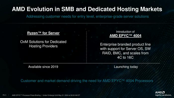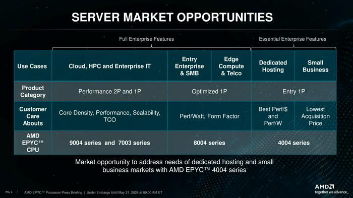 Within AMD’s various product stacks, the new EPYC 4004 family essentially replaces Ryzen chips for use in servers. Ryzen for servers was never a dedicated product lineup within AMD, but none the less it has been a product segment within the company since 2019, with AMD aiming it at smaller-scale hosting providers who opted to use racks of consumer-scale hardware, rather than going the high-density route with high core count EPYC processors.