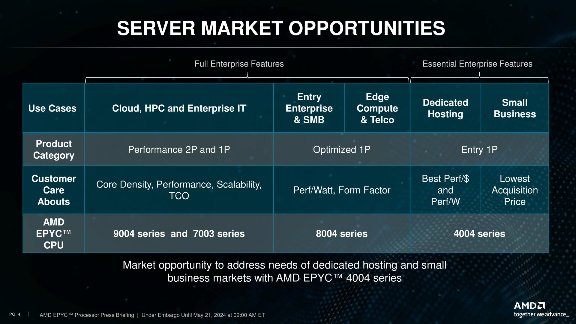 With the upgrade to EPYC status, that hardware ecosystem is being re-deployed as a proper lineup with dedicated chips, and a handful of additional features befitting an EPYC chip. Consequently, AMD is also expanding the scope of the market segments they’re targeting by a hair, roping in small business (SMB) users, whom AMD wasn’t previously chasing. Though regardless of the name on the market segment, the end result is that AMD is carving out a budget-priced series of EPYC chips with 4 to 16 cores based on their consumer platforms.