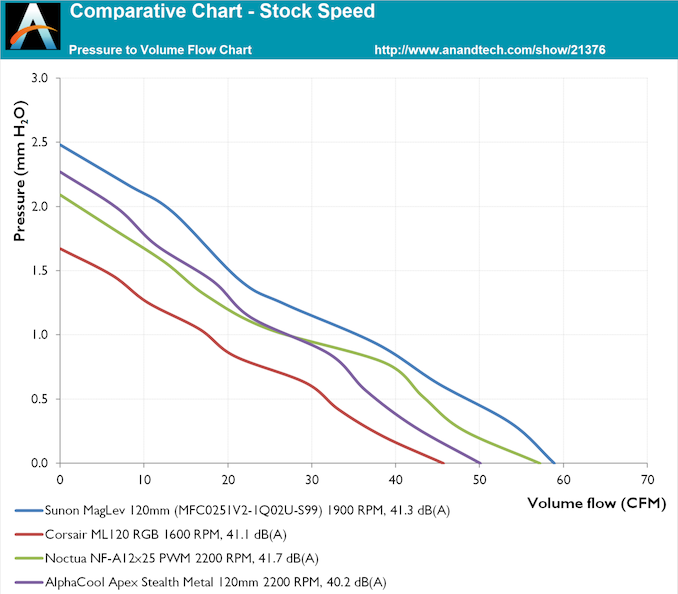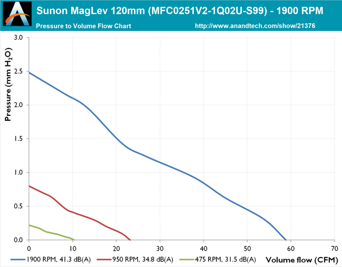 Test Results & ConclusionThe Sunon MFC0251V2-1Q02U-S99 is a robust performer across the entirety of the performance chart. At its maximum speed of 1900 RPM, it offers an airflow of 58.9 CFM and a static pressure of 2.48 mmH2O. However, that performance comes with a noise output of 41.3 dB(A), which is quite noticeable and, in most cases, not really ahead of its competition. When compared to the Corsair ML120, another fan with a magnetic levitation engine, the Sunon model tends to offer significantly better performance by running about 300 RPM faster while generating about the same level of noise.