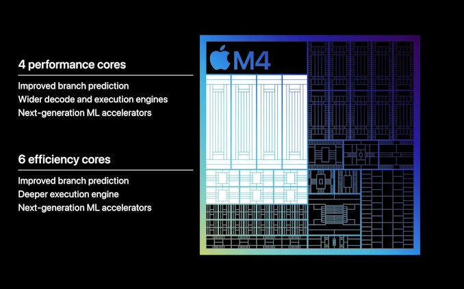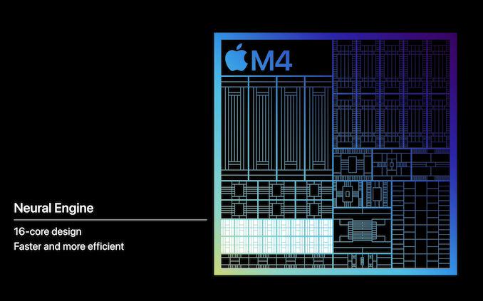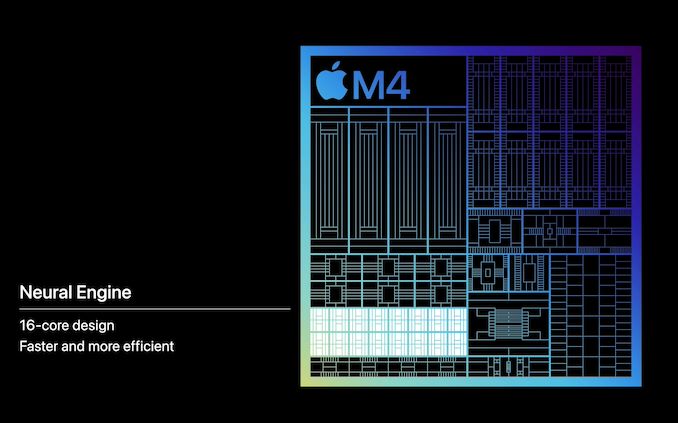 Apple M-Series (Vanilla) SoCs SoC M4 M3 M2 CPU Performance 4-core 4-core 4-core (Avalanche) 16MB Shared L2 CPU Efficiency 6-core 4-core 4-core (Blizzard) 4MB Shared L2 GPU 10-Core Same Architecture as M3 10-Core New Architecture - Mesh Shaders & Ray Tracing 10-Core 3.6 TFLOPS Display Controller 2 Displays? 2 Displays 2 Displays Neural Engine 16-Core 38 TOPS (INT8?) 16-Core 18 TOPS 16-Core 15.8 TOPS Memory Controller LPDDR5X-7700 8x 16-bit CH 120GB/sec Total Bandwidth (Unified) LPDDR5-6400 8x 16-bit CH 100GB/sec Total Bandwidth (Unified) LPDDR5-6400 8x 16-bit CH 100GB/sec Total Bandwidth (Unified) Max Memory Capacity 24GB? 24GB 24GB Encode/ Decode 8K H.264, H.265, ProRes, ProRes RAW, AV1 (Decode) 8K H.264, H.265, ProRes, ProRes RAW, AV1 (Decode) 8K H.264, H.265, ProRes, ProRes RAW USB USB4/Thunderbolt 3 ? Ports USB4/Thunderbolt 3 2x Ports USB4/Thunderbolt 3 2x Ports Transistors 28 Billion 25 Billion 20 Billion Mfc. Process TSMC N3E TSMC N3B TSMC N5PAt a high level, the M4 features some kind of new CPU complex (more on that in a second), along with a GPU that seems to be largely lifted from the M3 – which itself was a new GPU architecture. Of particular focus by Apple is the neural engine (NPU), which is still a 16-core design, but now offers 38 TOPS of performance. And memory bandwidth has been increased by 20% as well, helping to keep the more powerful chip fed.