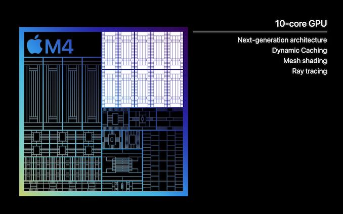 At any rate, this means the M4 comes with all of the major new architectural features introduced with the M3’s GPU: ray tracing, mesh shading, and dynamic caching. Ray tracing needs little introduction at this point, while mesh shading is a significant, next-generation means of geometry processing. Meanwhile, dynamic caching is Apple’s term for their refined memory allocation technique on M-series chips, which avoids over-allocating memory to the GPU from Apple’s otherwise unified memory pool.