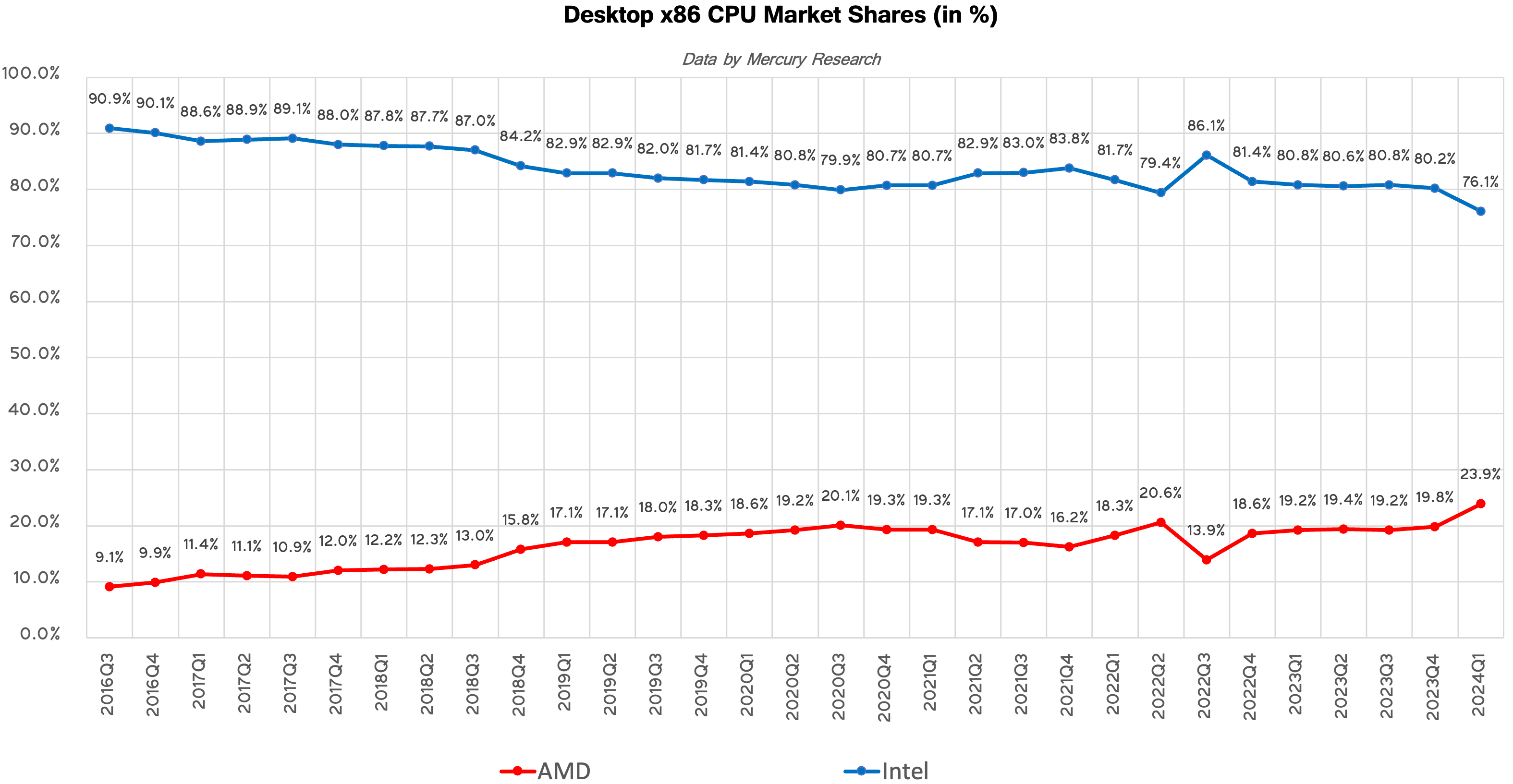The first quarter of this year was no exception, according to Mercury Research, as the company achieved record high unit shares on x86 desktop and x86 server CPU markets due to success of its Ryzen 8000-series client products and 4th Generation EPYC processors.