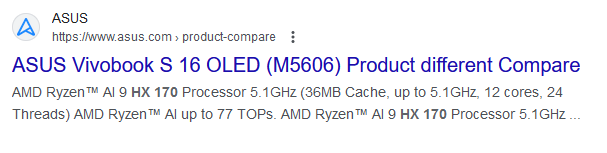 While it does happen in this industry occasionally, what looks like an accidental leak by ASUS on one of their product pages has unearthed an unknown processor from AMD. This first came to our attention via a post on Twitter by user @harukaze5719. While we don't speculate on rumors, we confirmed this ourselves by digging through Google's cache. Sure enough, as the image above from Google highlights, it lists a newly unannounced model of Ryzen mobile processor. Under the listing via the product compare section for the ASUS Vivobook S 16 OLED (M5606) notebook, it is listed with the AMD Ryzen AI 9 HX 170, which appears to be one of AMD's upcoming Zen 5-based mobile chips codenamed Strix Point.