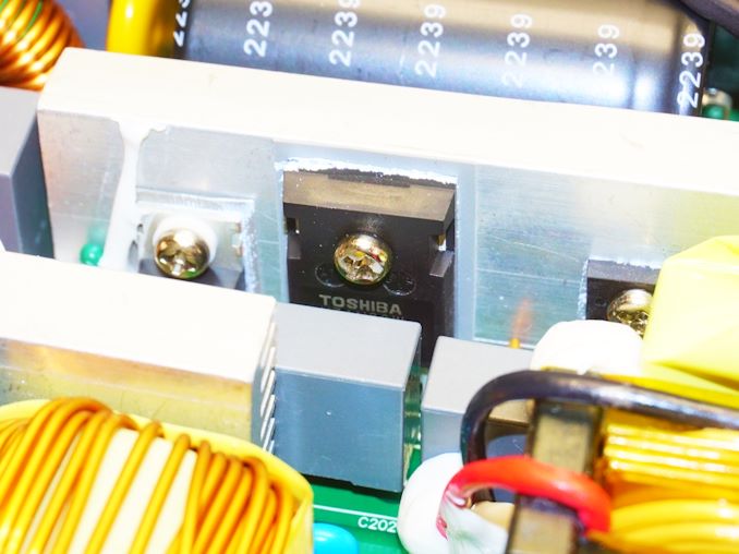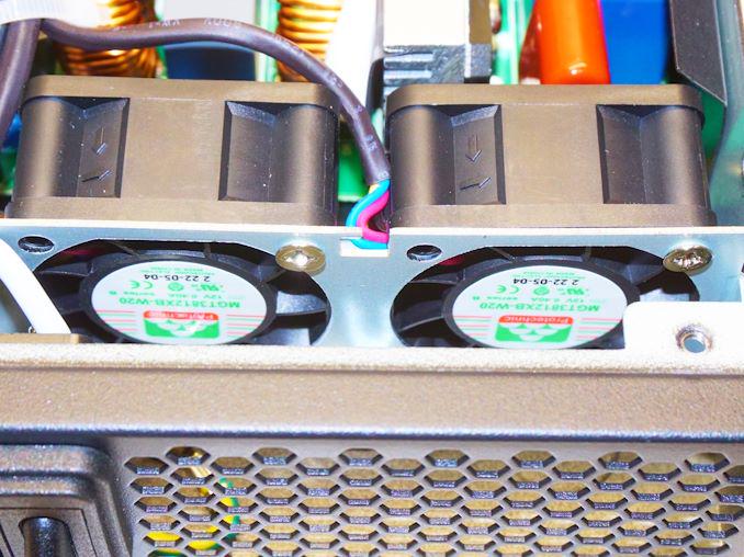 Then we have an APFC circuitry with a massive Aishi 450V/560μF capacitor and a large filtering coil being its passive components, with a Toshiba K31N60W regulator on the same heatsink as the two MOSFETs that form a typical half-bridge configuration. Following that we have a small transformer and two Infineon 045N10N MOSFETs to generate the 20V power output. Cooling is provided by two Protechnic Electric MGT3812XB-W20 38 mm fans, which are small but high quality products with a double-ball bearing engine.