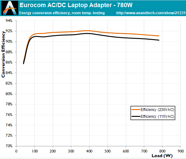 The average efficiency of the Eurocom 780W AC adapter is very high, at 91.6% when the PSU is powered from an 230V AC source and drops down to 90.9% when powered from an 115V AC source. There is no 80Plus or similar efficiency certification covering this PSU, but there is legislation such as the Ecodesign 2019/1782 directive, and, even though the manufacturer does not fully publish its performance specs as the directive requires, the Eurocom 780W adapter seems to easily meet them. We must mention that this kind of PSU has an advantage over classic PC PSUs because it only generates a single voltage line, and conversion losses are lower, so it should not be directly compared to any multi-voltage output PSU.