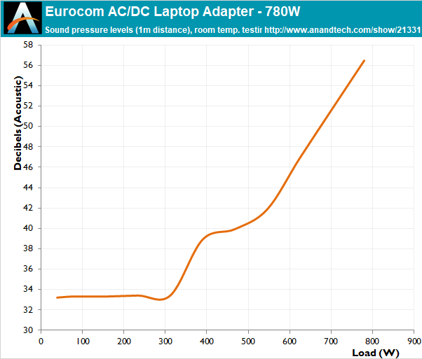 The two small fans of the Eurocom 780W AC adapter seem hardwired to the power output of the unit, largely ignoring the temperature of the adapter and adjusting their speed only according to the load. Up to 40% load, which should cover the power needs of most gaming laptops anyway, the adapter is practically entirely silent. The speed of the fan gradually increases when the load is greater than 330 Watts, reaching terrifying noise figures at maximum load. Given the nature of the adapter, it is highly unlikely that it will operate at such high a load for prolonged periods of time, as even the laptops that require 2x330 Watt adapters will not continuously sustain such a high load.