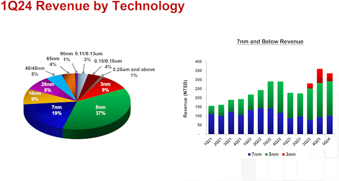 Generally, advanced technology nodes (N7, N5, N3) generated 65% of TSMC's revenue (down 2% from Q4 2023), while the broader category of FinFET-based process technologies contributed 74% to the company's total wafer revenue (down 1% from the previous quarter).
