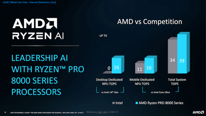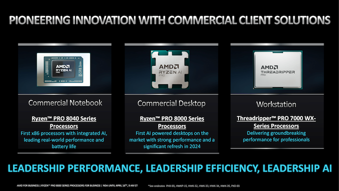 AMD is looking to drive the AI PC market with options across multiple product lines, which aren't limited to consumer processors. While primarily designed for the commercial sector, AMD has announced the Ryzen Pro 8000 'Phoenix' series of APUs for desktops, which AMD claims is the first professional-grade CPU to include an NPU designed to provide on-chip AI neural processing capabilities. AMD has also announced the Ryzen Pro 8040 'Hawk Point' series of mobile processors designed for commercial laptops and notebooks.
