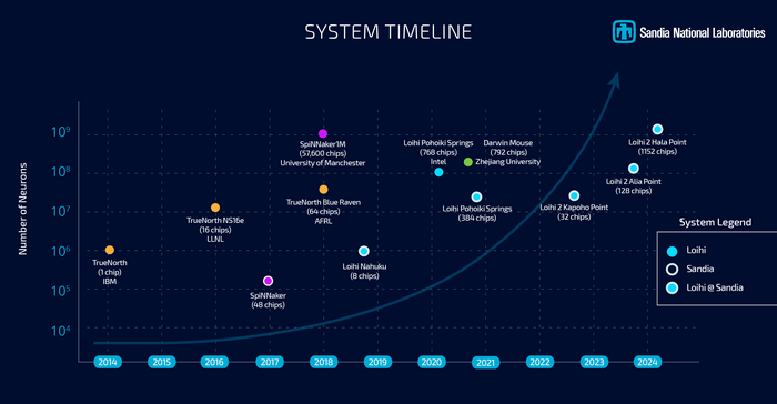 The Hala Point system incorporates 1152 Loihi 2 processors, each of which is capable of simulating a million neurons. As noted back at the time of Loihi 2’s launch, these chips are actually rather small – just 31 mm2 per chip with 2.3 billion transistors each, as they’re built on the Intel 4 process (one of the only other Intel chips to do so, besides Meteor Lake). As a result, the complete system is similarly petite, taking up just 6 rack units of space (or as Sandia likes to compare it to, about the size of a microwave), with a power consumption of 2.6 kW. Now that it’s online, Hala Point has dethroned the SpiNNaker system as the largest disclosed neuromorphic system, offering admittedly just a slightly larger number of neurons at less than 3% of the 100 kW British system.
