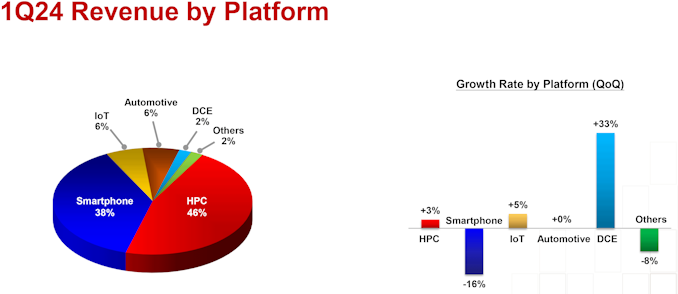 "Moving on to revenue contribution by platform. HPC increased 3% quarter-over-quarter to account for 46% of our first quarter revenue," said Huang. "Smartphone decreased 16% to account for 38%. IoT increased 5% to account for 6%. Automotive remained flat and accounted for 6%, and DCE increased 33% to account for 2%."