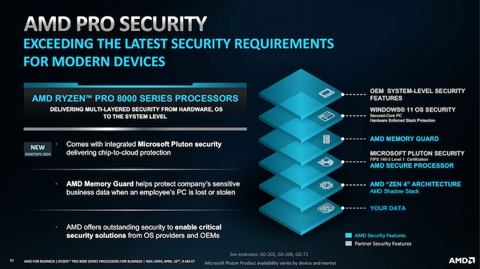 AMD's Ryzen Pro 8000 and Ryzen Pro 8040 series processors come with support from AMD's Pro Manageability and AMD Pro Business Ready suites and are built with AMD's current generation Zen 4 cores. The Ryzen Pro 8000 and Ryzen Pro 8040 series processors are similar to their consumer-level counterparts. However, they have additional security features such as AMD Memory Guard, AMD Secure Processor, and Microsoft Pluton.