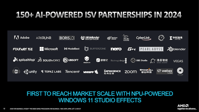 The other notable thing is that all of the Ryzen Pro 8040 series processors, except the bottom SKU, the Ryzen 5 Pro 8540U, come with AMD's Ryzen AI NPU integrated into the silicon. While the AI PC ecosystem is still growing, AMD and over 150+ ISVs look to continue the trend that AI will power more software features in the future than we've seen so far. We are still in the infancy stage of the ecosystem despite much of the marketing targeting the AI functionality, but as we see higher-performing NPUs coming in the next generation of chips, at least ones that can match Microsoft 45 NPU TOPS requirement to run Copilot locally, much of the benefit of the NPU is currently down to how much power can be saved.