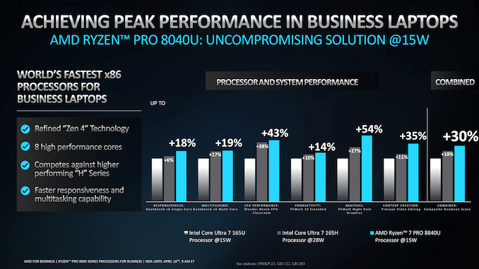 AMD's in-house performance figures show the Ryzen 7 Pro 8840U at 15 W performing better than Intel's Core Ultra 7 165H at 28 W. Still, as we always do with performance figures provided by vendors, take these with a pinch of salt. AMD claims a 30% combined increase in performance across the board in workloads, including Geekbench v6, Blender, PCMark 10, PCMark Night Raid, and UL Procyon. While there are plenty of different areas where performance gains and losses can be achieved, AMD does claim that their Ryzen 9 Pro 8945HS at 45 W vs. the Intel Core Ultra 9 185H at 45 W is 50% better in Topaz Labs Video AI Gaia 4X software; they did both use discrete graphics in this test according to AMD's slide deck.