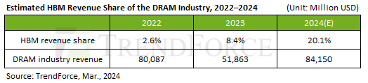 As first reported by Reuters, SK hynix CEO Kwak Noh-Jung has commented that he expects HBM sales will constitute a double-digit percentage of its DRAM chip sales in 2024. This prediction corroborate with estimates from TrendForce, who believe that, industry-wide, HBM will account for 20.1% of DRAM revenue in 2024, more than doubling HBM's 8.4% revenue share in 2023.
