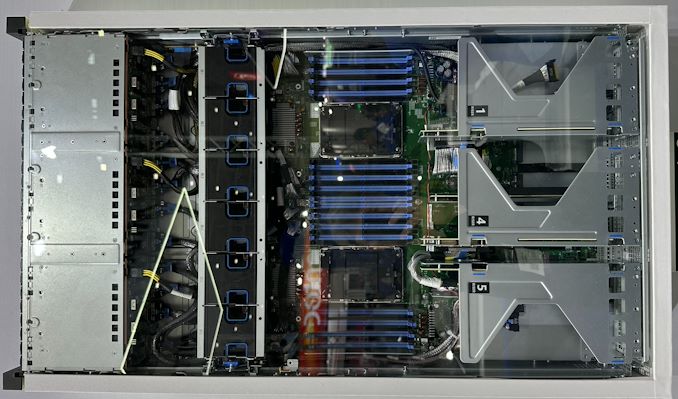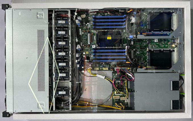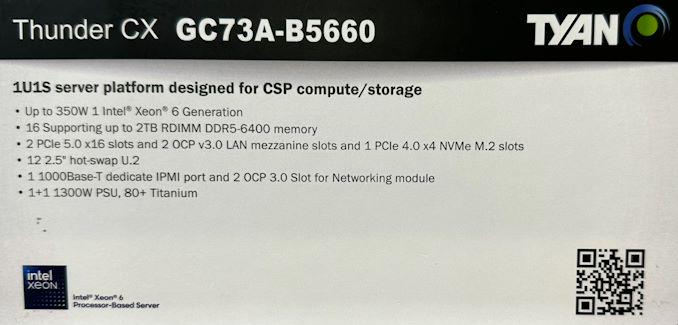 Meanwhile Tyan had the single-socket Thunder CX GC73A-B5660 on display. That system supports up to 2 TB of DDR5-6400 memory over 16 RDIMMs and offers two PCIe 5.0 x16 slots, one PCIe 4.0 x4 M.2 slot, two OCP 3.0 slots, and 12 hot-swappable U.2 drive bays.