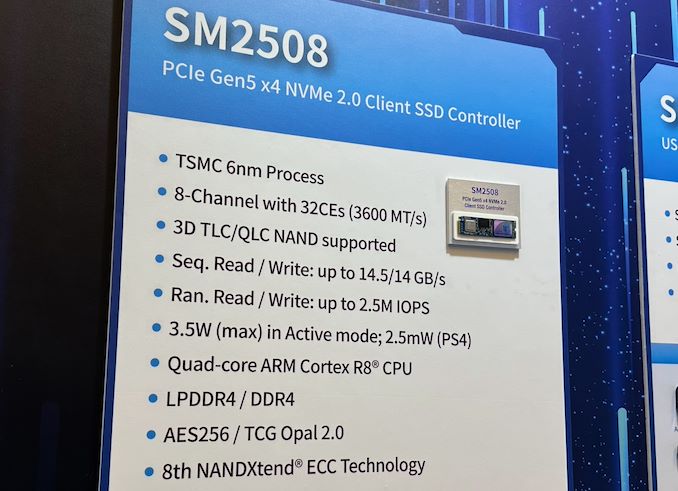 Silicon Motion NVMe Client SSD Controller Comparison SM2508 SM2264 SM2268XT2 SM2269XT Market Segment High-End Mainstream Manufacturing Process 6nm 12nm 12nm 12nm CPU Cores 4x Cortex R8 4x Cortex R8 2x Cortex R8 2x Cortex R8 Error Correction 4K+ LDPC 4K LDPC 4K+ LDPC 4K LDPC DRAM DDR4, LPDDR4X DDR4, LPDDR4X No No Host Interface PCIe 5.0 x4 PCIe 4.0 x4 PCIe 4.0 x4 PCIe 4.0 x4 NVMe Version NVMe 2.0 NVMe 1.4 NVMe 2.0 NVMe 1.4 NAND Channels, Interface Speed 8 ch, 3600 MT/s 8 ch, 1600 MT/s 4 ch, 3600 MT/s 4 ch, 1600 MT/s Sequential Read 14.5 GB/s 7.5 GB/s 7.4 GB/s 5.1 GB/s Sequential Write 14 GB/s 7 GB/s 6.7 GB/s 4.8 GB/s 4KB Random Read IOPS 2500k 1300k 1200k 900k 4KB Random Write IOPS 2500k 1200k 1200k 900kUnder the hood, the front-end of the SM2508 SSD controller is based around four Arm Cortex-R8 cores, which will make it a notably powerful controller (Phison's E26, for reference, is two Arm Cortex R5 cores with an accelerator). This controller is meant to be used with DRAM, as well, and will support both DDR4 and LPDDR4.