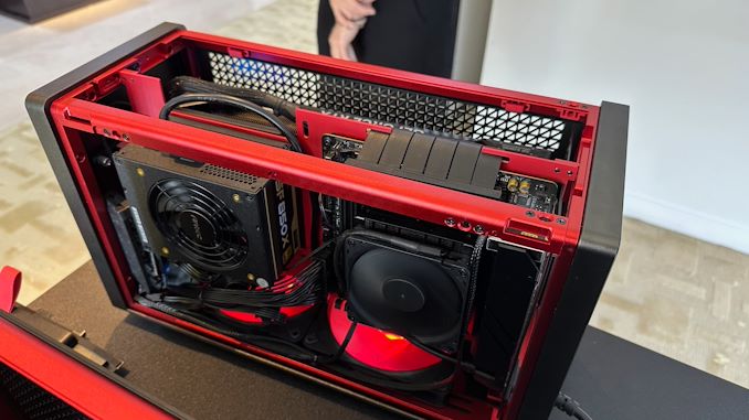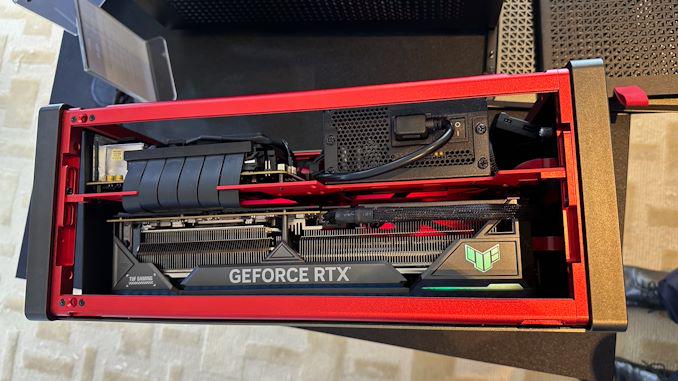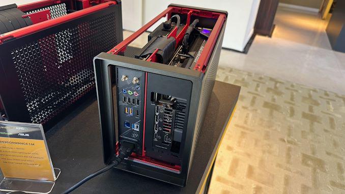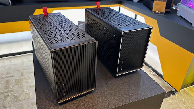 Antec's Performance 1M is a dual-chamber Mini-ITX chassis that splits off the video card from the rest of the system. The primary chamber houses a Mini-ITX motherboard and an SFX power supply, while the secondary chamber houses a huge graphics card. Notably, the two chambers are bridged using a PCIe riser cable, allowing the motherboard chamber to be far shorter than even a half-height PCIe card, while the video card chamber can hold a triple-slot video card parallel to the motherboard chamber, cutting down on wasted space. For Antec's Computex demo, the company had a triple-slot ASUS GeForce RTX 4090 installed to showcase how this worked.