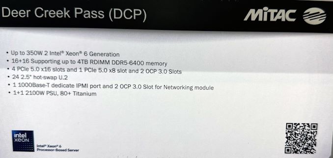 The company's other platform is TX77A-E7142 (Deer Creek Pass), a considerably more serious offering that replaces Intel's M50FCP platform. This board can house up to 4 TB of DDR5-6400 RDIMMs over 32 slots (16 per CPU with 2DPC), four PCIe 5.0 x16 slots, one PCIe 5.0 x8 slot, two OCP 3.0 slots, and 24 hot-swap U.2 bays. Deer Creek Pass can be used both for general-purpose workloads, high-performance storage, as well as workloads that require GPUs or other special-purpose accelerators.