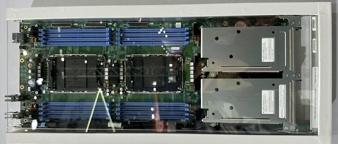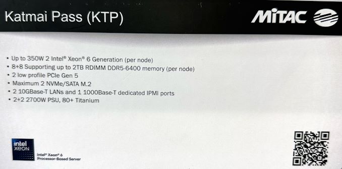 The most basic platform that MiTAC had to show is their TX86-E7148 (Katmai Pass), a half-width 1U system that's the successor to Intel's D50DNP platform. Katmai Pass has two CPU sockets, supports up to 2 TB of DDR5-6400 RDIMMs over 16 slots (8 per CPU), and has two low-profile PCIe 5.0 x16 slots. Like its predecessor, this platform is aimed at mainstream servers that do not need a lot of storage or room to house bulky add-in cards like AI accelerators.