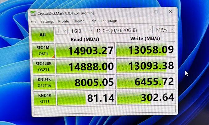 The back-end of the chip offers eight NAND channels with 32 CE targets, supporting interface speeds up to 3600 MT/s. Altogether, SMI says that the controller can hit sequential read speeds of up to 14.5GB/sec and write speeds of up to 14 GB/s, while 4K random read and write performance will reach up to 2.5 million IOPS. And SMI's demo drive at Computex did even better than that, achieving a 14.9GB/sec read speed under CrystalDiskMark.