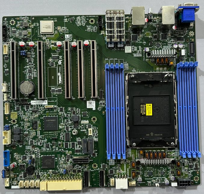 Finally, Tyan's Thunder HX S5662 is an HPC server board specifically designed to house multiple AI accelerators and other large PCIe cards. This board supports one Xeon 6 6700 processor, up to 1 TB of memory over eight DDR5-6400 RDIMMs, and has five tradiitonal PCIe 5.0 x16 slots as well as two PCIe 5.0 x2 M.2 slots for storage.