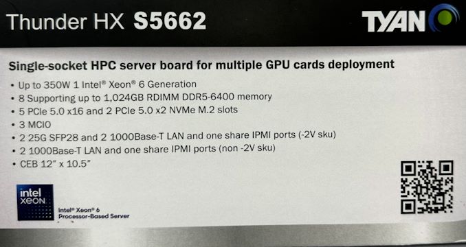 To that end, MiTAC and its subsidiary Tyan were at this year's event to demonstrate what they've been up to since acquiring Intel's server business unit, as well as to show off the server platforms they're developing for the Xeon 6 family. Altogether, the companies had two server platforms on display – a compact 2S system, and a larger 2S system with significant expansion capabilities – as well as a pair of single-socket designs from Tyan.