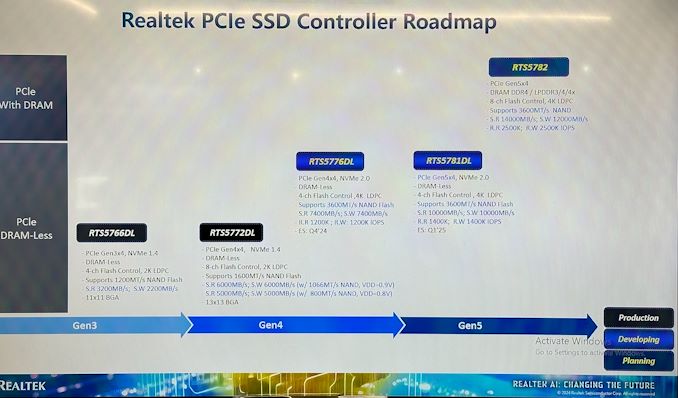 Realtek NVMe SSD Controller Comparison RTS5782 RTS5781DL RTS5776DL RTS5772DL RTS5766DL Market Segment High-End Mainstream Entry-Level Error Correction 4K LDPC 2K LDPC DRAM DDR4, LPDDR4(X) No No No No Host Interface PCIe 5.0 x4 PCIe 5.0 x4 PCIe 4.0 x4 PCIe 4.0 x4 PCIe 3.0 x4 NVMe Version NVMe 2.0 NVMe 2.0 NVMe 2.0 NVMe 1.4 NVMe 1.4 NAND Channels, Interface Speed 8 ch, 3600 MT/s 4 ch, 3600 MT/s 4 ch, 3600 MT/s 8 ch, 1600 MT/s 4 ch, 1200 MT/s Sequential Read 14 GB/s 10 GB/s 7.4 GB/s 6 GB/s 3.2 GB/s Sequential Write 12 GB/s 10 GB/s 7.4 GB/s 6 GB/s 2.2 GB/s 4KB Random Read IOPS 2500k 1400k 1200k - - 4KB Random Write IOPS 2500k 1400k 1200k - -Diving a bit deeper into Realtek's roadmap, the RTS5776DL is traditional DRAM-less PCIe Gen4 x4 controller with four NAND channels, and is aimed at entry-level drives. The controller's NAND support is quite modern, however, supporting the latest ONFI/Toggle standards, which will allow it to hit NAND transfer rates up to 3600 MT/second. Across four channels, that's enough bandwidth to fully saturate a PCIe 4.0 x4 connection with sequential read/writes, while random 4K IOPS can burst as high as 1.2 million. Engineering samples of the controller are set to emerge in Q4 2024, so do not expect actual drives based on this chip to emerge for sale until the second half of next year at the earliest.