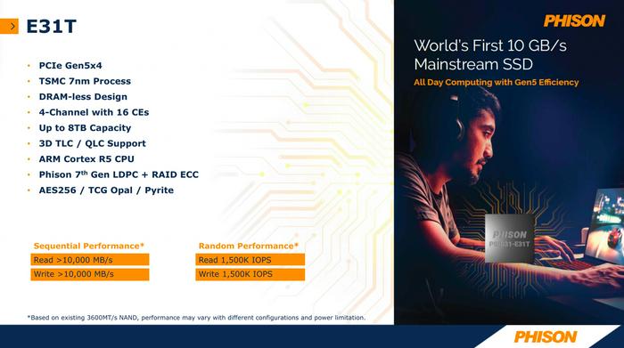 Phison NVMe SSD Controller Comparison E31T E27T E21T E26 E18 Market Segment Mainstream Consumer High-End Consumer Manufacturing Process 7nm 12nm 12nm 12nm 12nm CPU Cores 2x Cortex R5 1x Cortex R5 1x Cortex R5 2x Cortex R5 3x Cortex R5 Error Correction 7th Gen LDPC 5th Gen LDPC 4th Gen LDPC 5th Gen LDPC 4th Gen LDPC DRAM No No No DDR4, LPDDR4 DDR4 Host Interface PCIe 5.0 x4 PCIe 4.0 x4 PCIe 4.0 x4 PCIe 5.0 x4 PCIe 4.0 x4 NVMe Version NVMe 2.0 NVMe 2.0 NVMe 1.4 NVMe 2.0 NVMe 1.4 NAND Channels, Interface Speed 4 ch, 3600 MT/s 4 ch, 3600 MT/s 4 ch, 1600 MT/s 8 ch, 2400 MT/s 8 ch, 1600 MT/s Max Capacity 8 TB 8 TB 4 TB 8 TB 8 TB Sequential Read 10.8 GB/s 7.4 GB/s 5.0 GB/s 14 GB/s 7.4 GB/s Sequential Write 10.8 GB/s 6.7 GB/s 4.5 GB/s 11.8 GB/s 7.0 GB/s 4KB Random Read IOPS 1500k 1200k 780k 1500k 1000k 4KB Random Write IOPS 1500k 1200k 800k 2000k 1000kPhison itself calls its E31T platform 'the first mainstream 10 GB/s platform,' which pretty much gives a performance indicator for some of the upcoming inexpensive PCIe Gen5 SSDs. As for random performance, we are talking about 1.5M IOPS per second, which is in line with performance offered by some of enterprise-grade PCIe Gen4 SSDs.